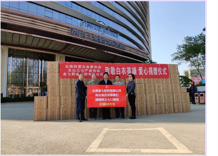 2020年3月31日下午,云南省民營企業(yè)家協(xié)會、文山三七產(chǎn)業(yè)協(xié)會、云南金七制藥有限公司在昆明花之城舉行了“致敬白衣英雄” 愛心捐贈儀式。云南省民營企業(yè)家協(xié)會會長花澤飛、文山三七產(chǎn)業(yè)協(xié)會常務(wù)副會長王成標(biāo)、云南金七制藥有限公司黨支部書記和肇有等出席了捐贈儀式。