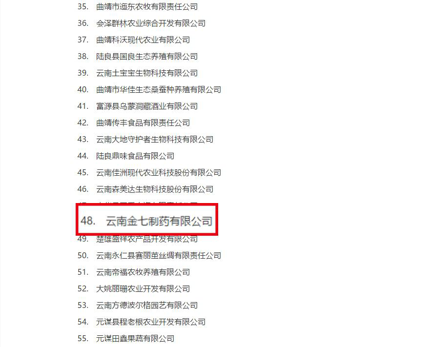 為培育壯大農(nóng)業(yè)產(chǎn)業(yè)化龍頭企業(yè),促進(jìn)高原特色農(nóng)業(yè)現(xiàn)代化,2月3日,云南省農(nóng)業(yè)農(nóng)村廳網(wǎng)站公布了第十五批農(nóng)業(yè)產(chǎn)業(yè)化省級重點(diǎn)龍頭企業(yè)名單,云南金七制藥有限公司成功入選。