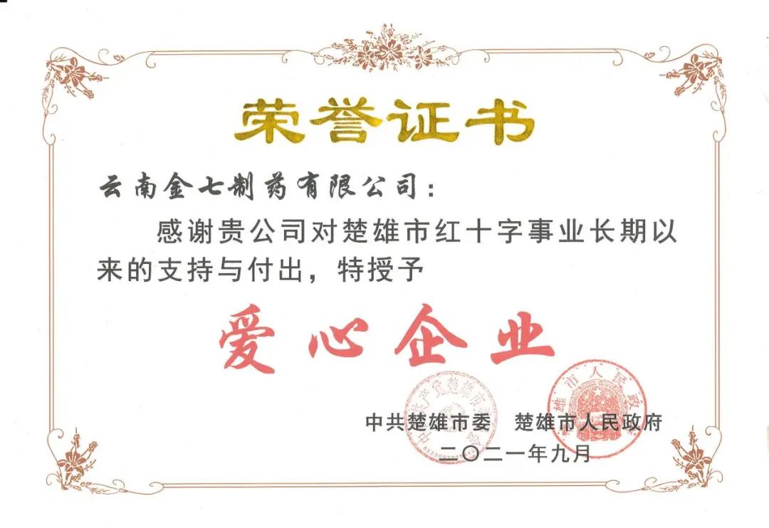 9月27日,楚雄市紅十字會(huì)第三次會(huì)員代表大會(huì)在楚雄市委黨校召開(kāi),在頒獎(jiǎng)儀式現(xiàn)場(chǎng),云南金七制藥有限公司被授予“愛(ài)心企業(yè)”榮譽(yù)稱(chēng)號(hào)。