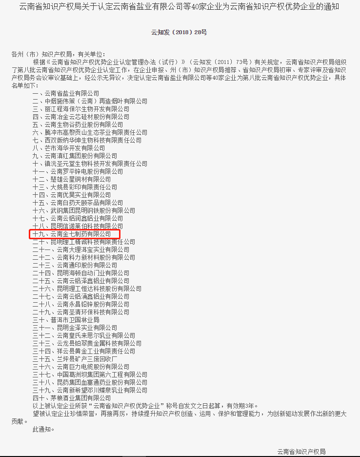 經(jīng)申報,云南金七制藥有限公司獲云南省知識產(chǎn)權(quán)局批準(zhǔn)擬定為“云南省知識產(chǎn)權(quán)優(yōu)勢企業(yè)”。作為云南省知識產(chǎn)權(quán)優(yōu)勢企業(yè),政府將給予一定經(jīng)費支持,用于開展企業(yè)知識產(chǎn)權(quán)培訓(xùn)、專利布局、專利信息利用、維權(quán)保護(hù)和推行《企業(yè)知識產(chǎn)權(quán)管理規(guī)范》(GB/T29490-2013)并有資格申報國家知識產(chǎn)權(quán)優(yōu)勢企業(yè)。