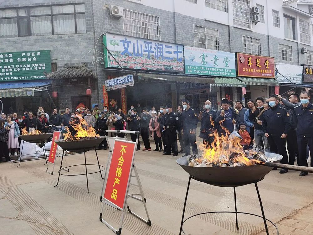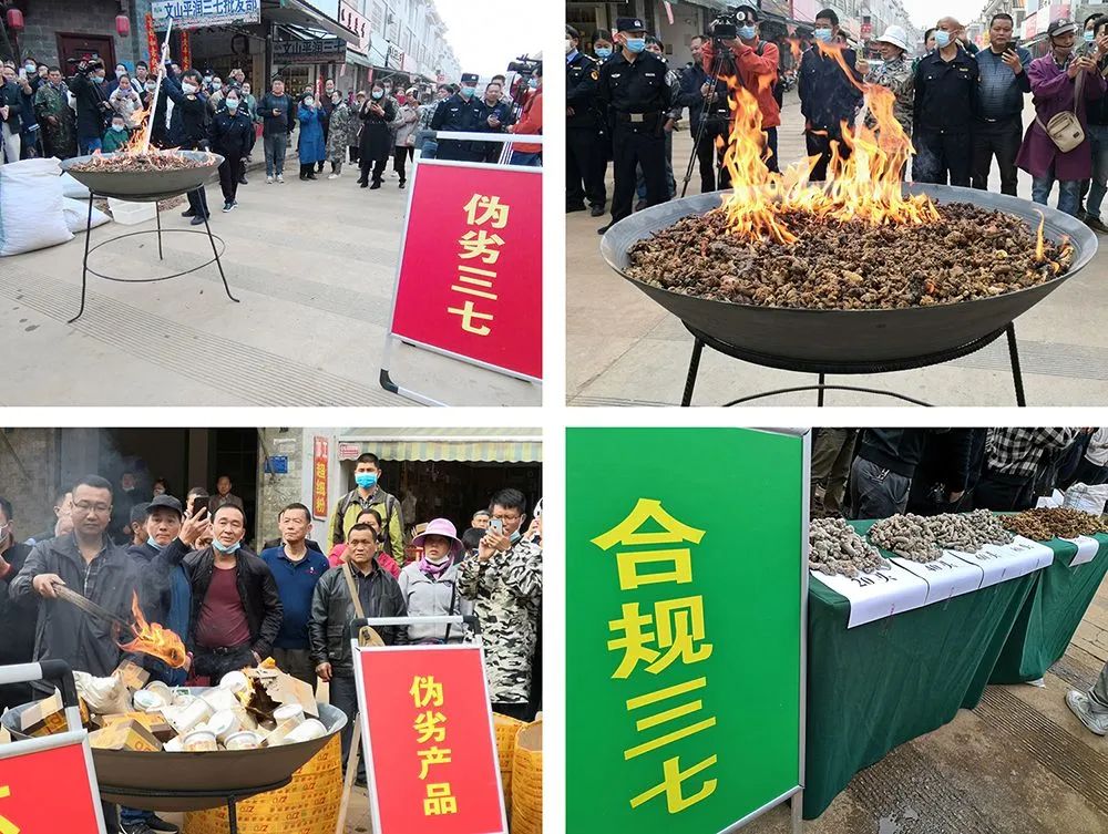 3月7日,文山三七品牌提升活動暨文山三七“健康日”啟動儀式在文山三七國際交易中心舉行?;顒由险故玖酥菔袌霰O(jiān)管局、州三七中醫(yī)藥發(fā)展中心,州商務局、州公安局等部門聯(lián)合開展執(zhí)法行動收繳的劣質三七500斤,價值兩萬余元,瓶裝、盒裝、散裝的假冒三無產品三七粉,價值10萬余元,并進行集中銷毀。