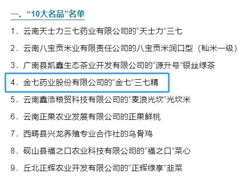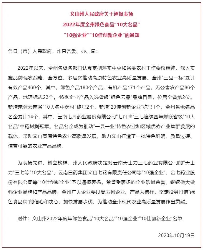 為深入實施文山州品牌強農戰(zhàn)略全方位、多層次推動,高原特色農業(yè)高質量發(fā)展。近日,文山州人民政府發(fā)布了《關于通報表揚2022年度全州綠色食品“10大名品”“10強企業(yè)”“10佳創(chuàng)新企業(yè)”的通知》,金七藥業(yè)再次入選文山州綠色食品“10強企業(yè)”“10佳創(chuàng)新企業(yè)”,“金七牌”三七精成為文山州2022年度綠色食品“10大名品”。